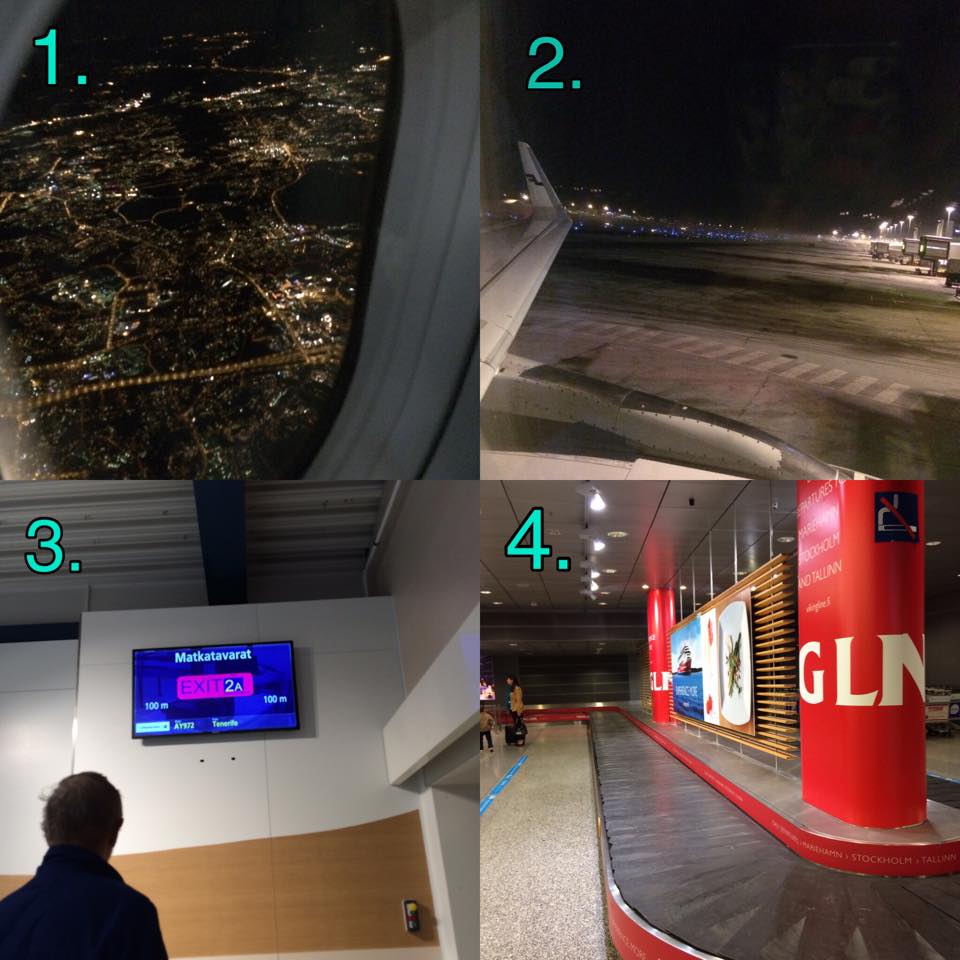 1. Vielä toinen kuva ennen laskeutumista. 2. Turvallisesti maassa ja Helsinki-Vantaan lentoasemalla. 3. & 4. Matkalaukkuja odottelemaan.
